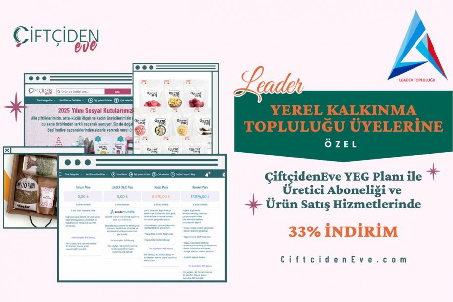 ÇiftçidenEve Pazar Yeri Doğal ve Organik Ürün Satış Platformu ile (LEADER) Yerel Kalkınma Topluluğu Derneği arasında 01 Aralık 2025 tarihinde anlaşma yapıldı. (LEADER) Yerel Kalkınma Topluluğu Derneği’ne tüzel kişilik ile üye olan YEG dernekleri ve STK üyeleri ile derneğimize üye olan gerçek kişilere, üyelik ve ürün sergileme hizmet bedelinde % 33 indirim yapılacaktır. ÇiftçidenEve Pazar Yeri Doğal ve Organik Ürün Satış Platformu tarafından % 33 indirimin yapılabilmesi için (LEADER) Yerel… Daha fazlasını oku »Dernek Üyelerimize ÇiftçidenEve Pazar Yeri’nde %33 İndirim !!!